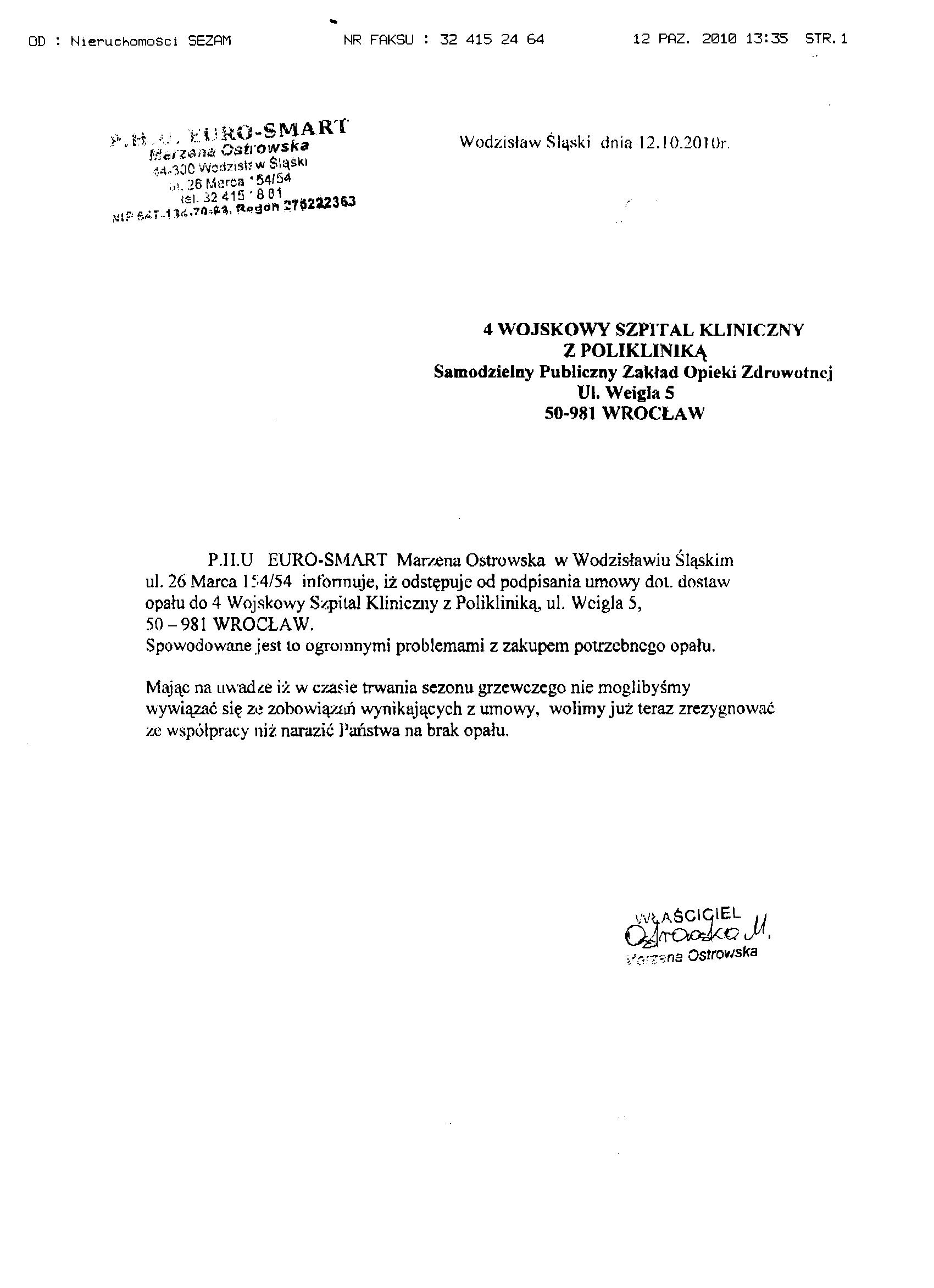 Zamawiający: 4 Wojskowy Szpital Kliniczny z Polikliniką Samodzielny Publiczny Zakład Opieki Zdrowotnej, 50 – 981 Wrocław, ul. Weigla 5 zawiadamia o unieważnieniu postępowania przetargowego w trybie przetargu nieograniczonego na dostawę koksu przemysłowego i miału węglowego na rok 2010/2011 , znak sprawy 96/Log./2010 w obrębie Pakietu 1( koks przemysłowy )na podstawie art. 93 ust.1 pkt. 7 ustawy PZP w związku z art. 94 ust.3 PZP, gdyż Zamawiający określił termin dostawy w Pakiecie 1 - dostawa jednorazowa w terminie od daty zawarcia umowy do 15.10.2010r., a o fakcie iż Wykonawca, który złożył najkorzystniejszą ofertę w obrębie Pakietu 1 odstąpił od podpisania umowy Zamawiający dowiedział się 12.10.2010r. ( fax. Od Wykonawcy – P.H.U EURO-SMART Marzena Ostrowska w załączeniu poniżej ). W związku powyższym dotrzymanie terminu realizacja zamówienia w obrębie Pakietu 1 jest niemożliwe, ponieważ ponowny wybór najkorzystniejszej oferty wymaga dotrzymania terminu o którym mowa w art. 94 ust. 1 pkt. 2 PZP ( nie krótszy niż 5 dni od dnia przesłania zawiadomienia o wyborze najkorzystniejszej oferty (…) ) co w zaistniałej sytuacji jest niewykonalne.