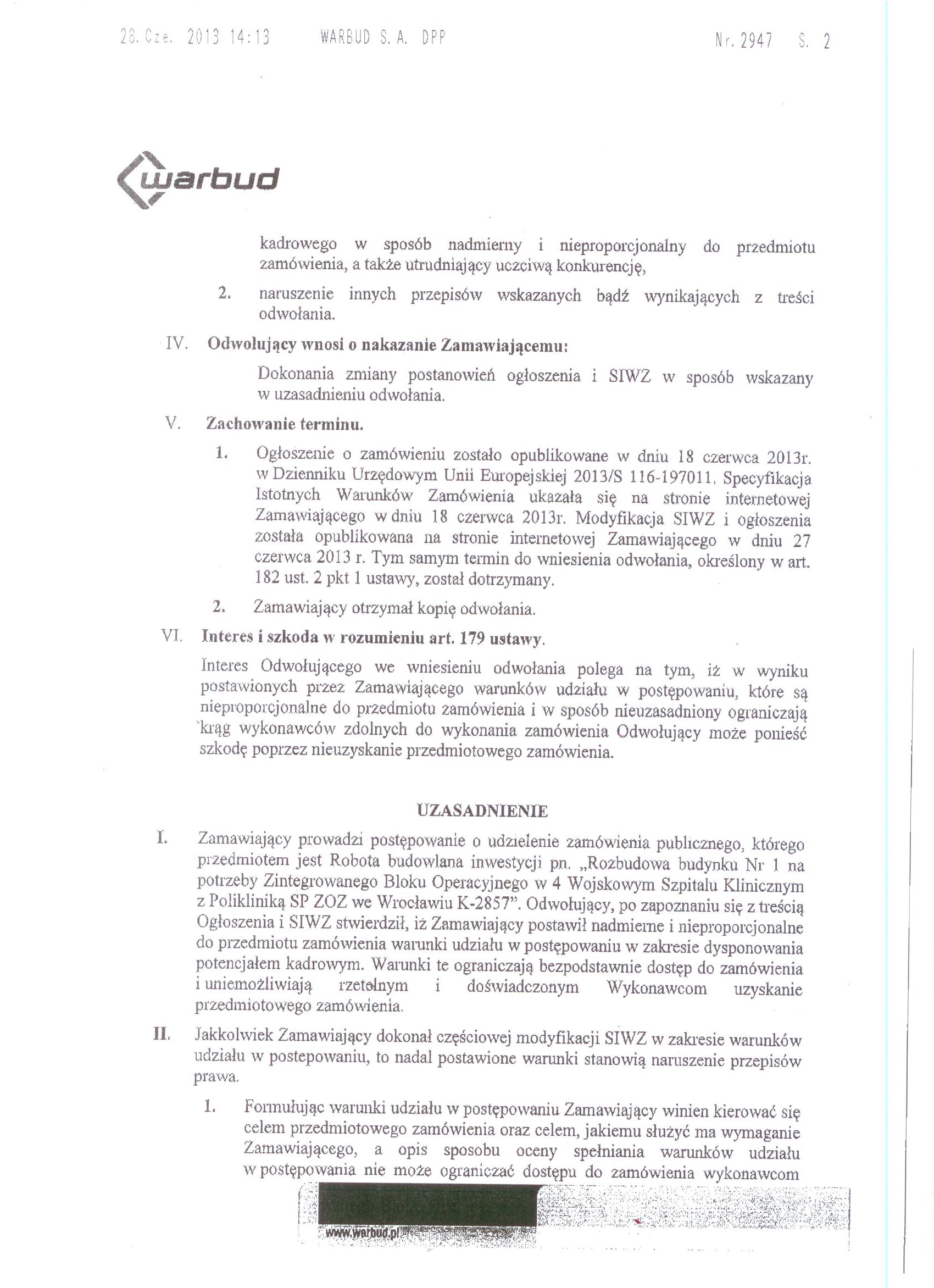 Działając na podstawie art. 185 ust. 1 ustawy Prawo zamówień publicznych (t.j. Dz.U. z 2010r. Nr 113, poz.759 z późn. zm.) Zamawiający: 4 Wojskowy Szpital Kliniczny z Polikliniką SP ZOZ we Wrocławiu zawiadamia, że w postępowaniu na robotę budowlaną inwestycji pn.: ,,Rozbudowa budynku Nr 1 na potrzeby Zintegrowanego Bloku Operacyjnego w 4 Wojskowym Szpitalu Klinicznym z Polikliniką SP ZOZ we Wrocławiu K-2857”, znak sprawy 77/Log./2013 w dniu 28.06.2013r. złożone zostało odwołanie w formie pisemnej.