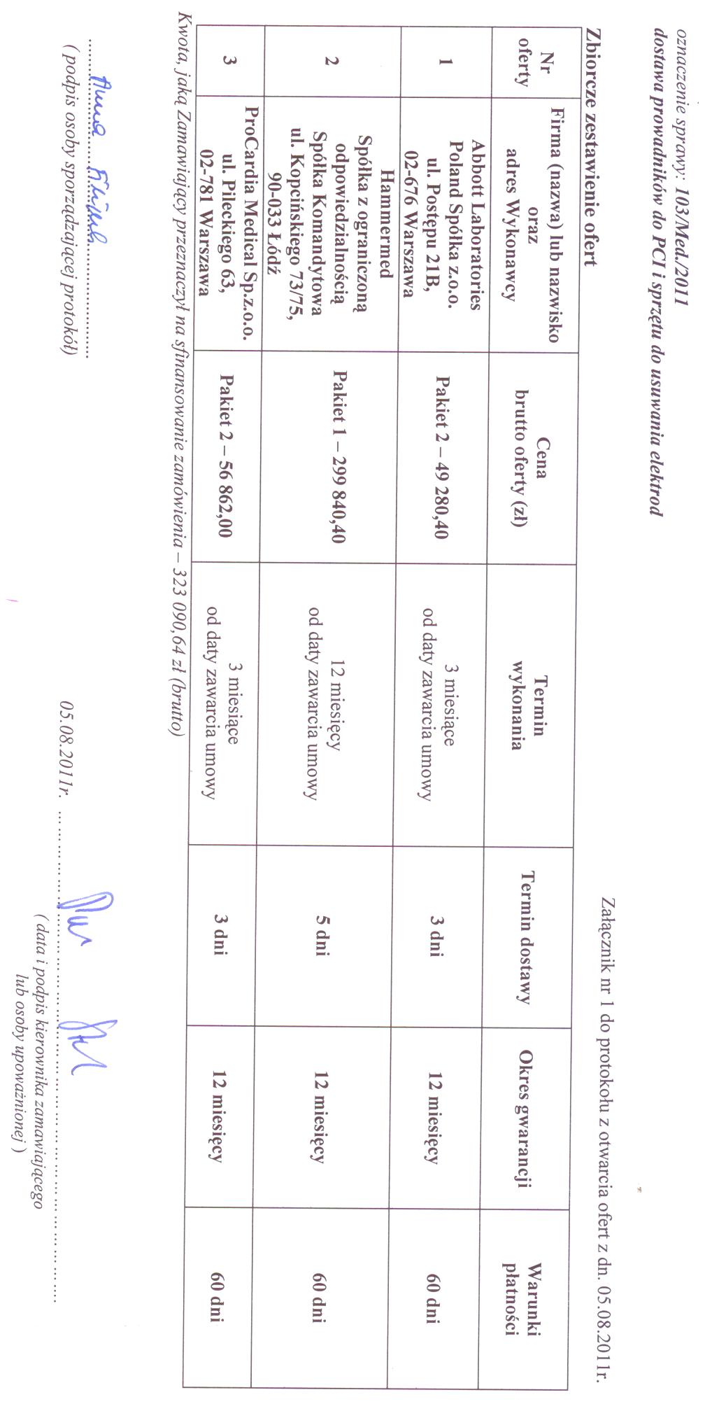 Zbiorcze zestawienie ofert w przetargu nieograniczonym na dostawę prowadników do PCI i sprzętu do usuwania elektrod, znak sprawy: 103Med./2011, otwarcie ofert: 05.08.2011r. w pliku do pobrania poniżej.